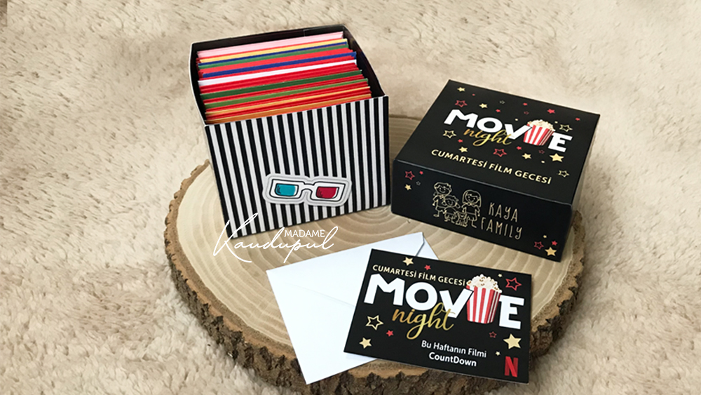 Film izlemeyi ailece çok seviyoruz. Cumartesi geceleri bizim için film gecesi demek. Her cumartesi olamayabiliyor tabi ama çoğunlukla öyle. Hangi filmi izleyeceğimize karar vermek bir hayli zaman alıyordu. Önce liste tutmayı düşündüm. Alt alta yazarız, gözümüz kapalı seçeriz hangisi gelirse onu izleriz diye düşünüyordum. Ama aklıma daha orijinal ve güzel bir fikir geldi. Film kutusu yapmaya karar verdim. Dış tasarımı da kutusu da her şey bana ait 🙂